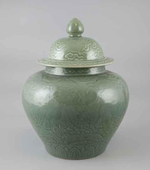Estimation:80/100 THAILANDE – XXe siècle. Jarre couverte en porcelaine émaillée céladon à décor incisé de dragons parmi les nuages. H. 50 cm. Expert : Cabinet Portier, Paris.