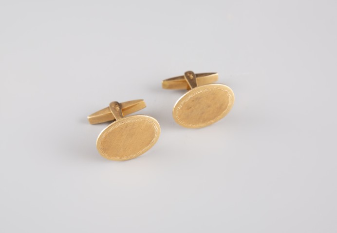 Estimation: 500/600 – Boutons de manchette en or jaune 18K 750°/°°, poinçon 750 et hibou, plateau de forme ovale à décor guilloché