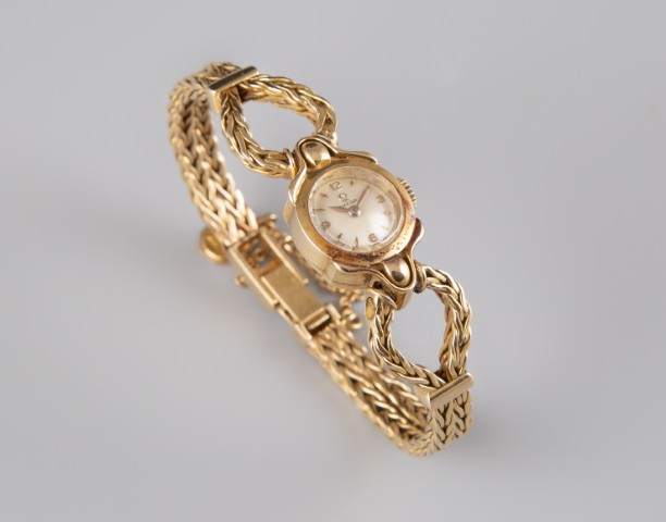 Estimation:700/900 OMEGA. Montre de dame en or jaune 18K 750°/°°, poinçon tête de cheval, cadran rond fond creme, bracelet tressé or. Vendue avec sa garantie. Poids brut 31,50g.