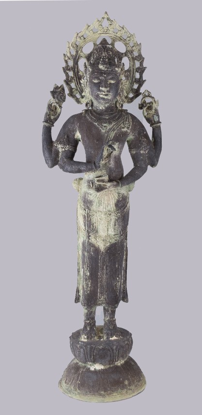 Estimation:300/400 INDONESIE – XXe siècle. Statuette de divinité à quatre bras en bronze à patine brune, debout sur un socle, devant la mandorle. H. 95 cm. Expert : Cabinet Portier, Paris.