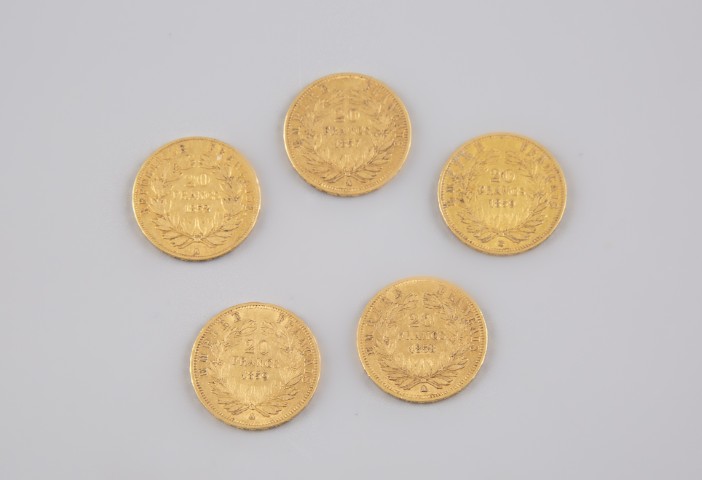 Estimation:2000/3000 Lot de cinq pièces de 20 francs or Napoléon III tête nue, 1852, 1857, 1858, 1859×2. Poids 32,09g.