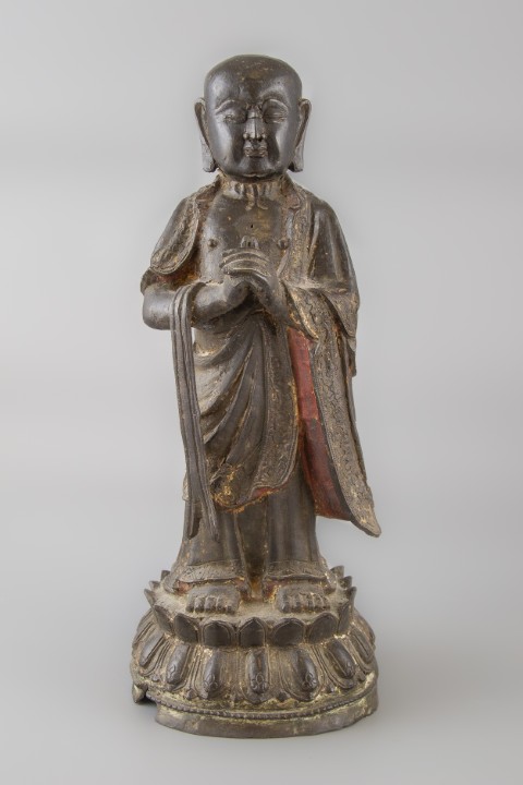 Estimation:1000/1500 CHINE – Dynastie MING (1368 – 1644). Statuette du moine Ananda en bronze à patine brune, debout sur un socle en forme de lotus, les mains jointes devant lui. (Petits accidents). H. 36 cm. Expert : Cabinet Portier, Paris.