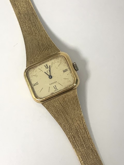 Estimation:1000/1200 OMEGA. Montre de dame en or jaune 18k 750°/°°, poinçon 750, boitier plat rectangle à fond crème, chiffres romains, bracelet serpent. Poids brut 49,94g. Mouvement non garanti vendu en l’état. Poussières sous le verre.