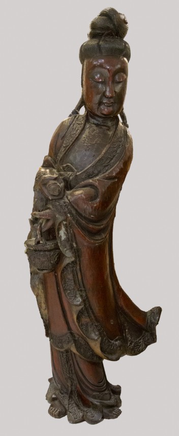 Estimation:2000/3000 CHINE – Vers 1900. Grande statue de Guanyin en bois laqué brun rouge représentée debout, tenant un panier dans sa main gauche et un rouleau de sa main droite, les yeux mi-clos, les cheveux ramassés en chignon. Les bordures de sa robe décorées en léger relief de fleurs. 120x47x27cm. (Manques). Expert : Cabinet Portier, Paris.