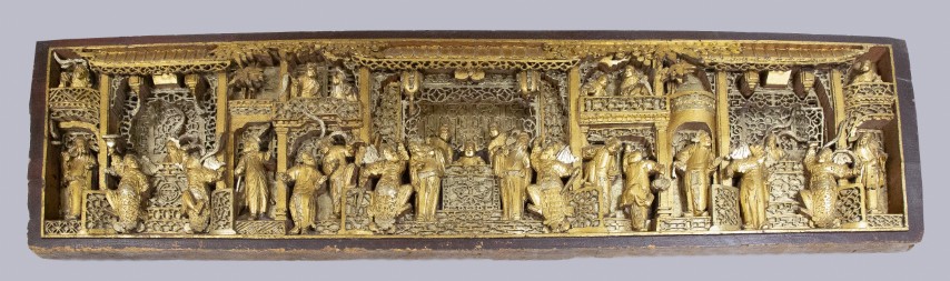 Estimation:600/800 CHINE, Ningpo – Vers 1900. Grand panneau décoratif en bois sculpté en relief et laqué or et rouge de scènes représentant des acteurs dans un théâtre vêtus de robes richement décorées, et de spectateurs dans leurs loges. 60x211cm. (Petits accidents). Expert : Cabinet Portier, Paris.