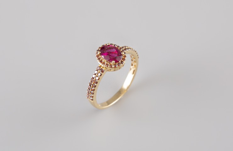 Estimation:150 / 250 Bague en or jaune 18k 750°/°°, sertie d’une tourmaline d’env. 1ct et grenats. Tour de doigt 60. Poids brut 3,50g.