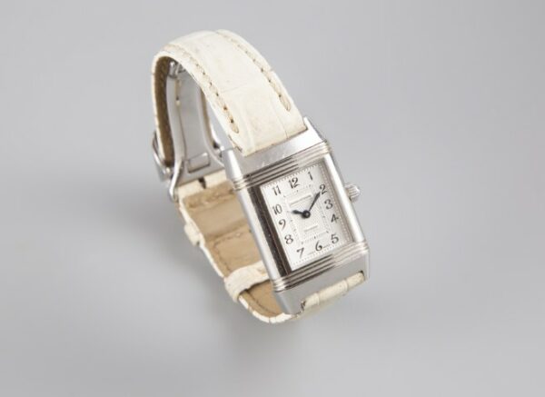 Estimation:1800/2000 JAEGER LECOULTRE. Montre de dame en acier, modèle Reverso Duetto, ref 266 8 44, double face en acier, d’un côté le cadran godroné sobre et classic, fond gris, chiffres romains, de l’autre un cadran habillé serti d’une double ligne de brillants, fond guillauché centré de nacre beige. Bracelet JLC en cuir blanc (usé) avec boucle déployante d’origne en acier siglé. mouvement quartz, mécanique remontage manuel. Diamètre: 20 x 22mm. Vendue avec son certificat de garantie de novembre 2000.