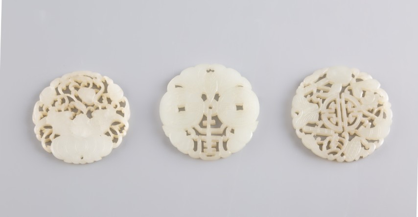 Estimation:300/400 CHINE – Vers 1900. Trois médaillons ronds en jade (néphrite) céladon à décor ajouré l’un de chauve-souris et melon, le deuxième de chauve-souris et deux sapèques, le troisième à décor des huit attributs des immortels. Diam. 5,3 et 5,5 et 5,5 cm. Expert : Cabinet Portier, Paris.
