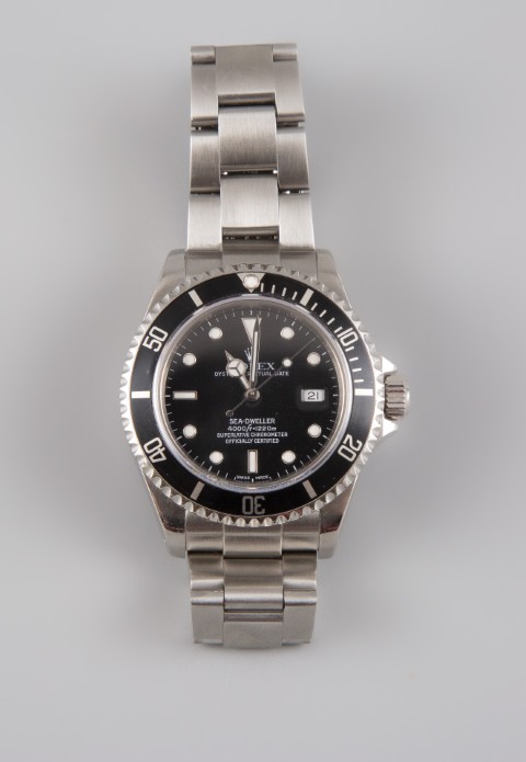 Estimation:7500/8000 ROLEX. Montre en acier, modèle Sea Dweller, Ref 16600 N°Y797735, avec lunette noire graduée tournante unidirectionnelle et couronne de remontoir siglée, cadran fond noir à index et aiguilles photoluminescentes avec trotteuse centrale et guichet date à trois heures. Bracelet Oyster à boucle déployante siglée, numérotée, Mouvement mécanique à remontage automatique. Vendue avec sa boite. Couronne bloquée.