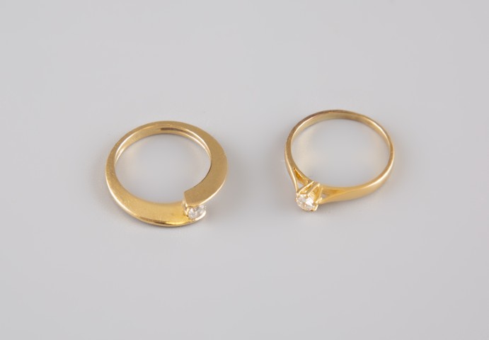 Estimation:300 / 500 Réunion en or 18K 750°/°° composé de : – Une bague centrée d’un diamant taille brillant (env. 0,12ct). Tour de doigt 52. Poids brut 3,60 g.