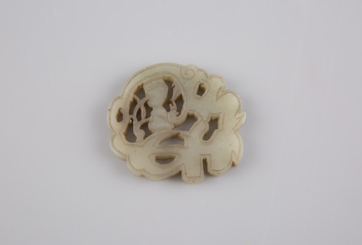 Estimation:200/300 CHINE – Vers 1900. Pendentif en jade (néphrite) céladon sculpté en forme de caractère « fu » (bonheur) et pêches de longévité. H. 5,1 cm. Expert: Cabinet Portier, Paris.