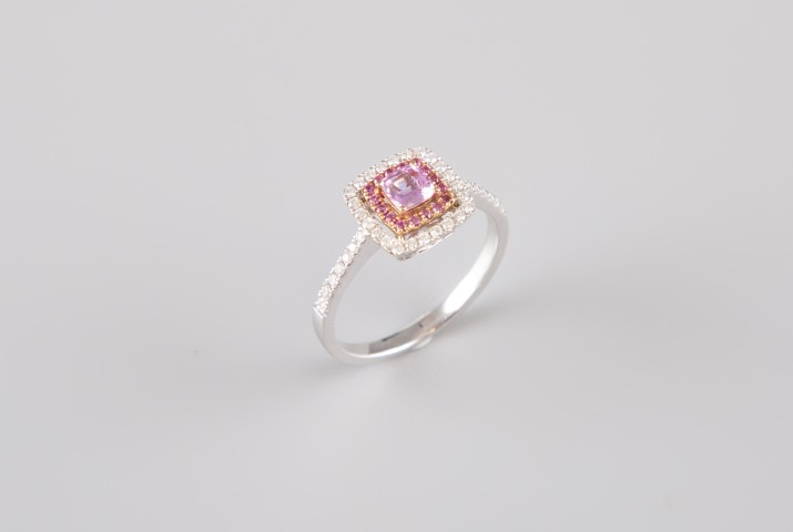 Estimation:150/250 Bague en or blanc 18k 750°/°°, poinçon hibou, plateau carré, centrée de saphirs roses (dont centre env. 0,40ct) et brillants (env. 0,60ct). Tour de doigt 55,5. Diamètre plateau 1cm. Poids brut 3,15g.