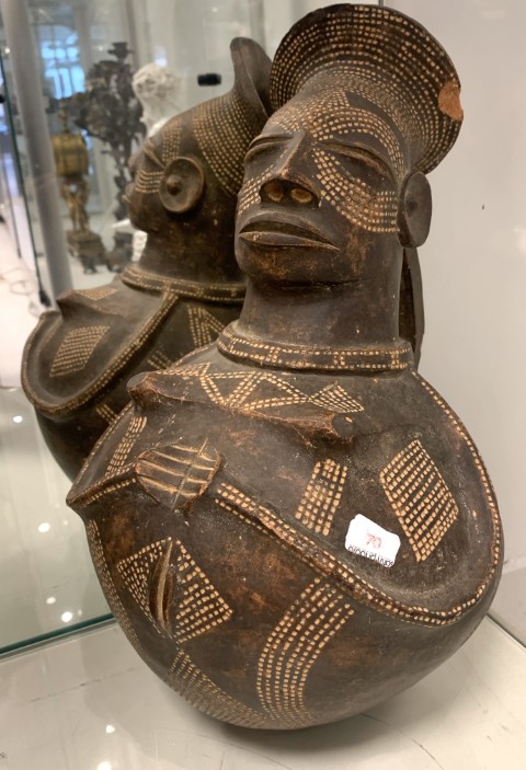 Estimation:100/200 REPUBLIQUE DEMOCRATIQUE du CONGO – MANGBETU. Jarre en terre cuite, à panse sphérique, ornée d’un visage prolongé d’une coiffe traditionnelle en entonnoir. Ht. 38cm. Rapporté de Cote d’Ivoire par l’ancienne propriétaire en 1972.