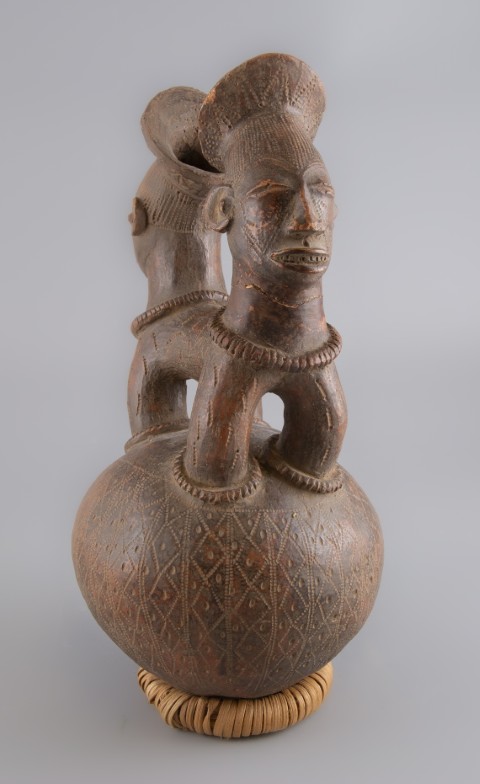 Estimation:100/200 REPUBLIQUE DEMOCRATIQUE du CONGO – MANGBETU. Jarre en terre cuite, à panse sphérique, ornée de deux visages feminins prolongés d’une coiffe traditionnelle en entonnoir. Ht. 39cm. Recollage à l’une des têtes.