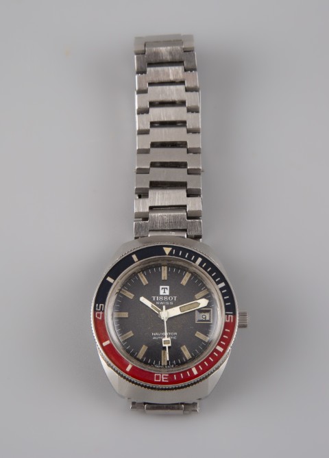 Estimation:800/1000 TISSOT. Montre en acier, modèle Navigator dite Pepsi, cadran fond noir, date à 3h, bracelet acier à boucle déployante. Mouvement automatique.