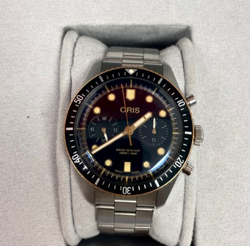 Estimation:2400/2500 ORIS. Montre chronographe en acier, modèle 65 chrono, cadran fond noir, index doré, lunette tournante bronze, mouvement automatique. Vendue avec sa carte de garantie, quatre maillons supplémentaires, boite, surboite, notice.