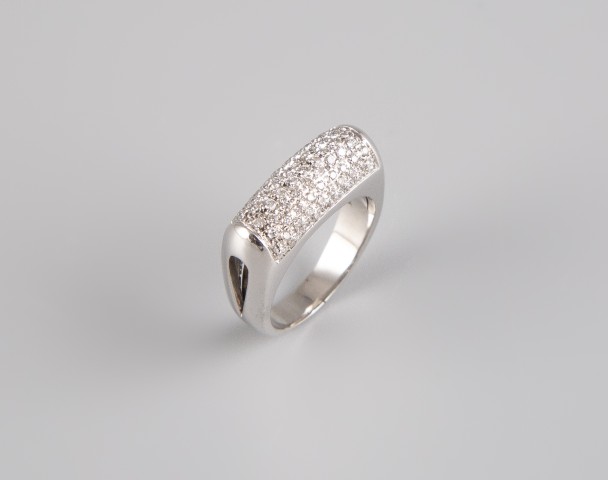 Estimation:500/700 Bague demi jonc cylindrique en or blanc 18K 750°/°°, poinçon hibou, pavée d’environ 1ct de diamants 8/8. Longueur plateau 2cm. Tour de doigt 56. Poids brut 10,90g.