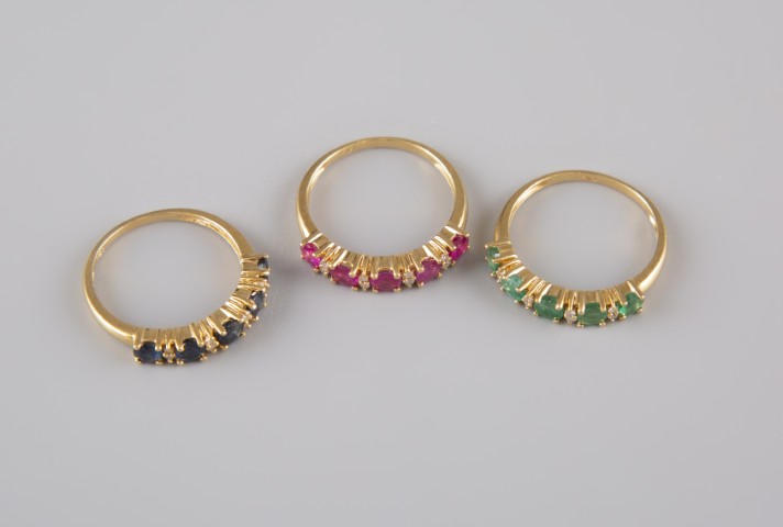 – Une bague sertie de saphirs (env. 0,50ct) et brillants. Tour de doigt54. Poids brut 2,40 g. – Une bague sertie d’émeraudes (env. 0,50ct) et brillants. Tour de doigt 54. Poids brut 2g.