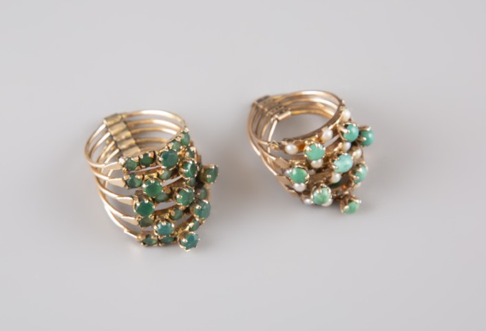 Estimation: 300/500 – Réunion de : – une bague en or jaune 14K 585/°°, poinçon coquille St Jacqes, multicorps articulé sertie de pierres vertes