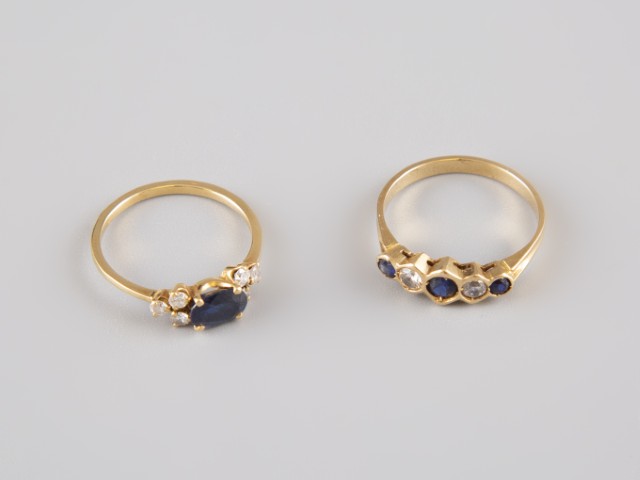 Estimation:150 / 250 Réunion de: – Une bague en or jaune 18K 750°/°° sertie d’un saphir ovale et brillants (env. 0,12ct). Tour de doigt 54. Poids brut 2,02g.