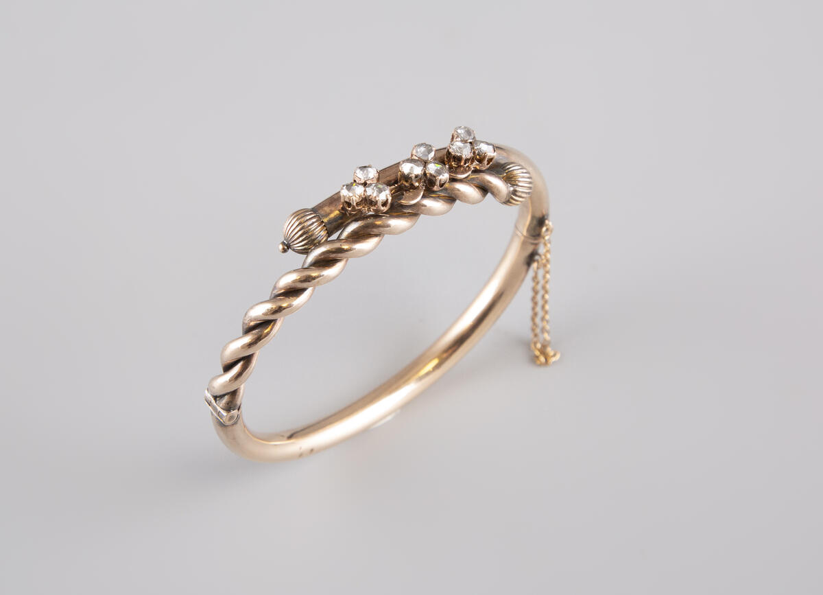 Estimation:250/300 Bracelet jonc articulé en or jaune 9k 750°/°°, poinçon trefle, à décor torsadé sur la partie haute et sertie de neuf diamants taille roses formant fleur. Travail du XIX° siècle. Diamètre intérieur 6x5cm. Poids brut 10,80g. Chainette de sécurité en cuivre.