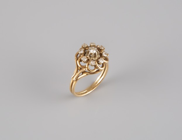 Estimation: 150/200 – Bague en or jaune 18k 750°/°°, poinçon tête d’aigle, serti en son centre de 9 diamants taille brillant formant fleur