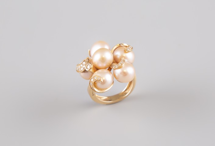 Estimation:1600/1800 MARCO MOLINARIO. Bague en or rose 18K 750°/°°, poinçon tête d’aigle, sertie de six perles rose formant fleur, épaulées de diamants taille brillant. Tour de doigt 55. Poids brut 15,33g.