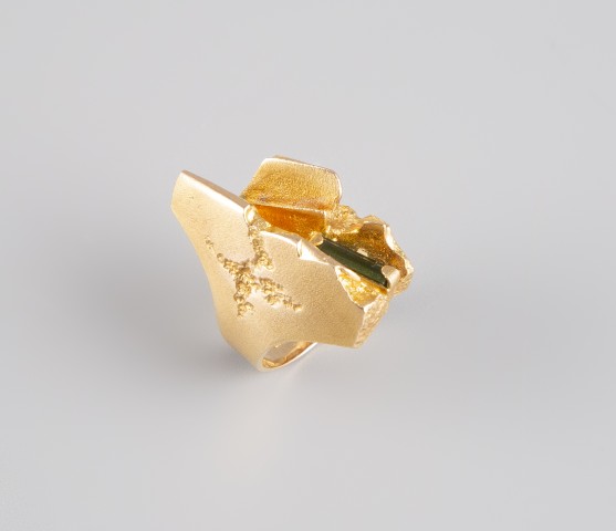 Estimation:300/500 Björn Weckström pour LAPPONIA, Finlande. Bague d’artiste asymétrique en or jaune 14 carats 585°/°°, coquille St Jacques, amatie et sertie d’une tourmaline verte taille baguette. Signée. Longueur plateau 2,8cm. Tour de doigt 53. Poids brut 11,83g.